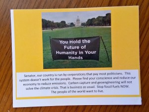 The next longshot is this. I took a crazy trip to DC and had these banners made with climate messages for the defunct government we have that takes our tax dollars and spends them in horrifying ways. I took a picture of each one with the Capitol in the background. Attached is the first one I made into a postcard with a message. I compiled all the addresses of all the senators and mailed the postcard to each one. Anyone who would like the first postcard, along with all the addresses, please let me know and I will send them to you. You can edit the message to your liking if you so desire.