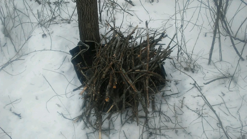 My boots sunk into the foot of snow, as I trudged through to an area of trees . . . and watched a rabbit scamper through the field to the other side of the woods . . . heard the snap of each dry branch as I added them to my pile . . . felt the falling snow on my face . . . wondered what kind of shelter I could build in the nook of some trees . . . heard the silence of the gray day . . . enveloped in a milky winter sky . . . felt the knowing eyes of the ancestors guiding me.